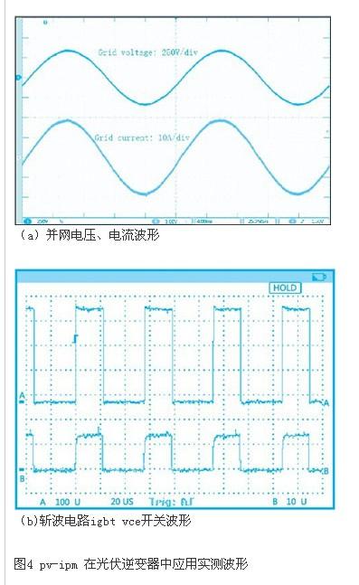 完善的驱动和保护功能,灵活的拓扑结构,紧凑的封装使pv-ipm能大大缩短客户的开发进度,提高光伏逆变器的可靠性。图4a)给出了使用50a/600v pv-ipm的光伏逆变器的满载运行时的输出波形。实验条件:并网电压为230 v/50 hz,直流侧电压udc=390v,并网电流thd=1.24%。
