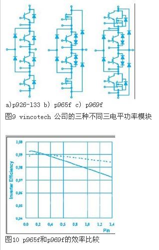 上面提到的igbt+mosfet混合及并联技术同样可以应用于三电平拓扑的功率模块中。图9b)p965f和图9c)p969f分别给出了混合和并联的三电平拓扑模块示例。由于引入的mosfet内部二极管不能承受大的无功电流,无功电流的流向成为一个问题。为解决这个问题,p965f和p969f在输出和直流母线间增加了1200v二极管,这样能输出无功功率,同时也可以用作高效率的双向逆变器,实现能量的反向变换,为了减少损耗,该二极管推荐使用sic二极管。同时,可见在该拓扑内管igbt的反并联二极管上串联了一个高压二极管,以防止mosfet关断时由于寄生电容而产生反向的充电电流流过igbt反并联二极管[2]。