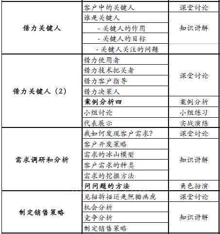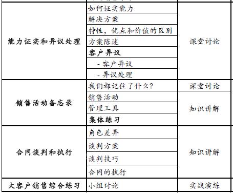 定位目标客户、建立销售流程、借力关键人、发现和挖掘客户需求、建立与客户之间的良好沟通、制定正确的销售策略、组织和提交增值解决方案、富有说服力的产品展示、处理客户异议技能、双赢的商务谈判等。