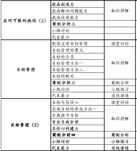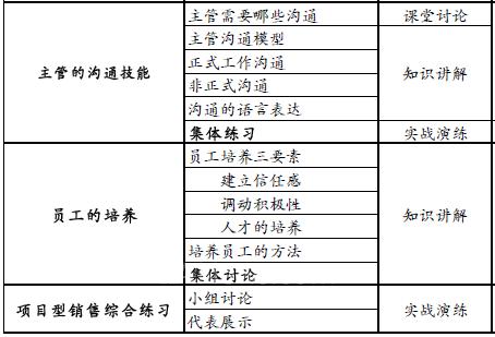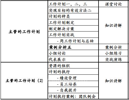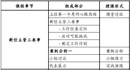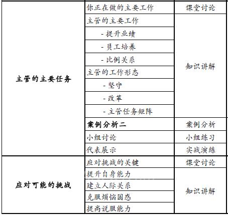 新任主管的工作任务定位;主管工作的形态,应对管理工作的挑战,说服力、创造力、解决问题能力、决策力,目标制定与管理,工作计划制定与执行,自我管理和提升,沟通方法与技能,资源的调动与组织,员工的培养……