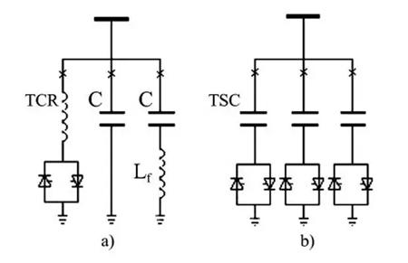 静止无功补偿装置(SVC)可分为电磁型和晶闸管控制型两大类。晶闸管控制型SVC主要类型有晶闸管控制电抗器(TCR)型、晶闸管投切电容器(TSC)型、以及这两者的混合装置TCR+TSC型和晶闸管控制电抗器与固定电容器的混合装置TCR+FC型、晶闸管控制电抗器与机械投切电容器的混合装置TCR+MSC型等。其中,TCR与TSC型原理图如下所示: