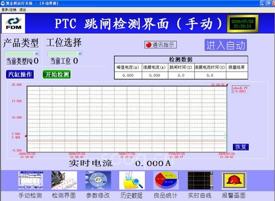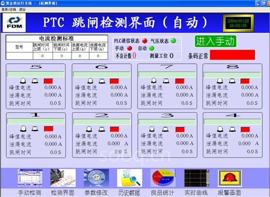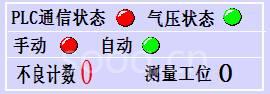 PTC自动检测界面,进入系统后首先检测PLC通讯状态及气压状态、不良品计数等,不符合条件不允许进行操作。