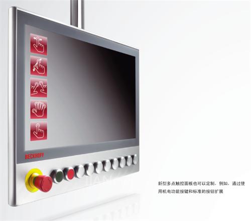 新型 CP2xxx 和 CP3xxx 多点触控面板系列拓展了可能的应用范围,增强了操作的便利性。这项技术也对客户化定制解决方案带来了深远影响。一方面,人们对显示屏或触摸屏的要求不断增长反映了技术上的进步。而另一方面,新的设备也必须适应各种设备的应用,因此,一些大客户已经放弃了先前使用的电阻式触摸技术,转向在多点触控设备的使用中更为坚固耐用的投射电容式触摸屏(PCT)技术。它们有很高的触点密度,能够在很短的响应时间内进行精确、可靠的操作。并且由于使用了 Beckhoff 自己的触摸控制器和独立编程的触摸屏灵敏度,需要时,用户戴着薄工作手套(如乳胶手套)也能够进行操作。