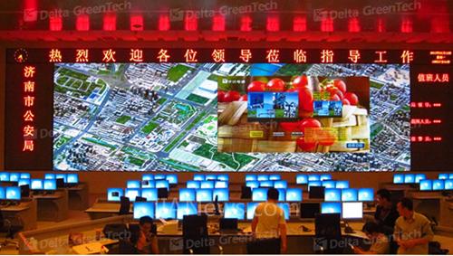 济南市公安局平安城市新建指挥中心由多个指挥控制室组成,包括指挥大厅、应急指挥中心、领导会商室,整个指挥中心监控大屏包括:80英寸4行×10列高清LED光源DLP拼接屏1套,67英寸3行×6列高清LED光源DLP拼接屏1套,50英寸2行×4列标清LED光源DLP拼接屏1套,并采用台达全球首创DVCS分布式图像控制系统作为图像控制系统。