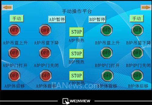 触摸屏手动画面可以手工控制预热、吊篮下降、吊篮上升、炉门关闭、炉门打开、炉体前移、炉体后移、冷风机启动/停止、热风机启动/停止。
