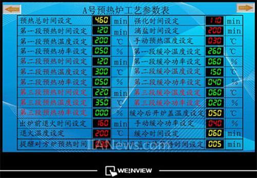 预热工艺参数画面设定钢化炉的PID各段预热时间、预热温度、预热功率,退火时间,退火温度、以及钢化时的盐离子交换时间。