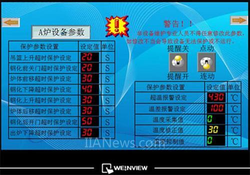 设备参数画面设置钢化炉的一些初始化的参数,如超温报警、温度修正、超时设定等设备点动运行以及连动运行切换。