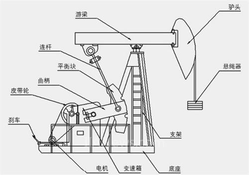 抽油机主要是把动力机(一般是电动机)的圆周运动转变为往复直线运动,带动抽油杆和泵。目前世界上大部分油井用机械采油法—有杆泵采油机,设备结构如图所示: