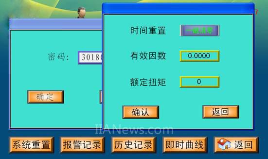 系统重置界面需要密码才能进入,输入正确的密码后,会弹出参数设置窗口,包括系统时间重置、有效因数、额定扭矩。