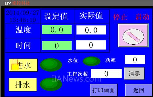 1、主画面:该画面为系统运行的画面,可以数显记忆和设定煮沸时间,加热温度,以及功率。显示当前温度,当前煮沸时间。电控排水与进水。
