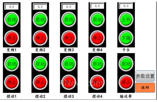 四台抛光轮电机,四台摆动轮电机,一台输送电机,一台高度调节电机。设备要求触摸屏具有调节变频器速度,显示平台当前高度的功能,可启动停止设备中的电机,变频器等。