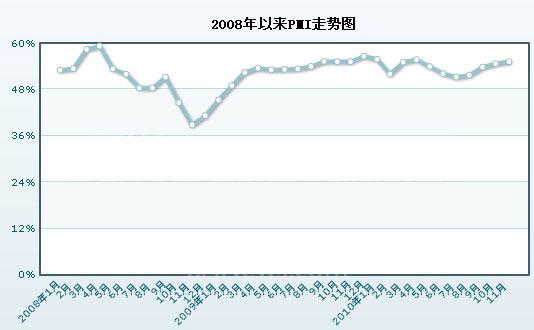 2010年11月,中国物流与采购联合会(CFLP)中国制造业采购经理指数(PMI)为55.2%,比上月上升0.5个百分点。