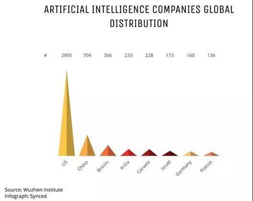 根据乌镇智库的一项研究,美国有2905家人工智能公司,中国有709家,英国有366家,印度有233家,在加拿大有228家,以色列有173家,德国有160家。