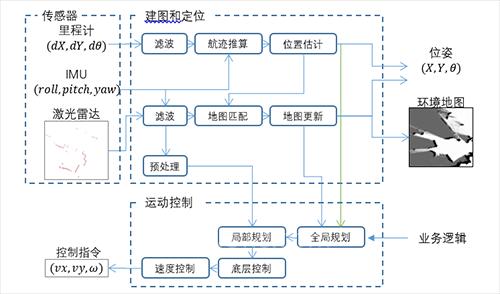 每个部分在实际工作当中是紧密联系在一起的,下图展示了一个典型的自主定位导航系统内部各组件的框架: