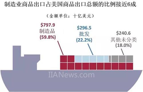 首先,衡量其对一国宏观经济的直接影响力,制造业可谓举足轻重。以美国为例,制造业GDP占到国家总GDP约12%。其中,如单列出口部分,制造业所占比例则高达59.8%(见下图)。