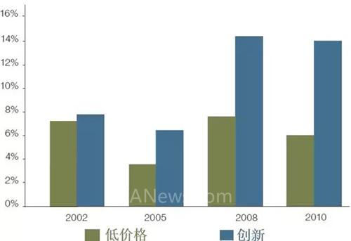 图中绿色表示将价格战作为竞争策略的企业的回报率;蓝色表示由创新策略主导的企业的回报率。注意到,2010年创新政策主导企业回报率约14%,而低价竞争策略主导企业回报率只有约6%,前者比后者高出两倍有余。(数据来源:Georgia Manufacturing Survey 2010; Georgia Manufacturing Survey 2008)