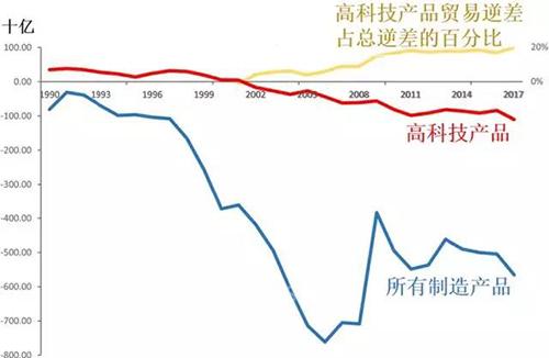 其中红线代表高科技产品的贸易差;蓝线代表总产品的贸易差;黄色线代表高科技产品贸易逆差占总逆差的百分比。由图可见,高科技产品于2001年由贸易顺差转为贸易逆差。(数据来源:Census Bureau, Foreign Trade Division)