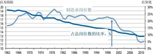 对于国计民生,美国制造业生态环境被破坏的后果是残忍的。自2000年到2010年间,大约有六万家美国工厂倒闭;制造业在职人员数量从1700万减少到1100万(见下图)。联系前述 “制造业岗位倍增系数” ,随之而来的就业冬天便不难想象了。至此,由制造业基地 “工厂” 的流失,到产品的锐减,技术工人群的萎缩,完成了一幅制造业生态环境惨遭破坏的图画。