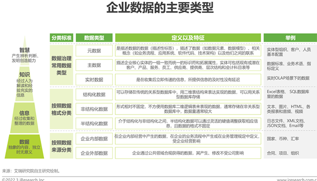 数据的价值被不断认可,“数据资产化”已经成为了企业发展的重要组成部分。长期以来,数据被理解为以数字形式存储的信息,而目前技术可以测量更多的事件和活动,人们可以收集、存储并分析这些不被视为传统数据的各类信息,如邮件、图片、音视频等。数据可根据其特性及治理方法差异划分为内部数据与外部数据,结构化数据、非结构化数据与半结构化数据,元数据与主数据等。
