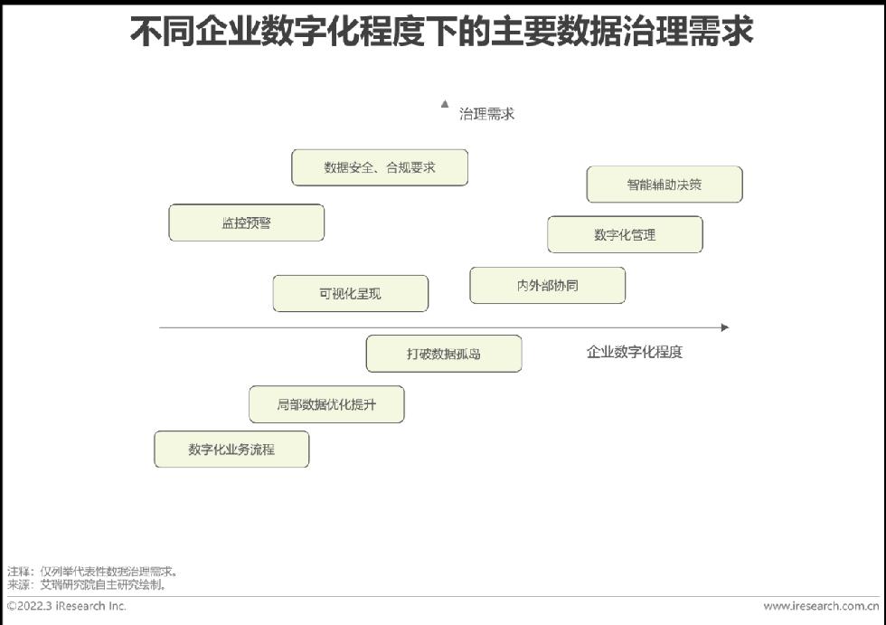 企业历经数字化转型不同阶段时,需通过数据治理解决数据在生产、管理和使用中的问题,而数据治理的需求与复杂度也会随着企业数字化程度提升而增加。从企业内部的数据类型来看,非结构化数据占企业内数据总量的80%,却仅占整体使用率的30%,长期以来其价值未得到充分有效利用。未来,随着非结构化数据的积累增加与AI应用的数据需求推动,企业对非结构化数据的价值化需求将加速释放,而多源异构数据基础下的数据治理模块也将获得进一步的关注与优化。