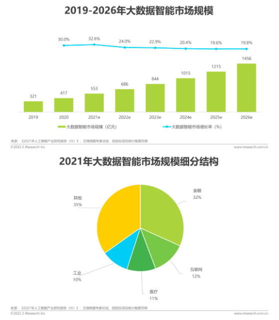 据艾瑞咨询统计测算,2021年涵盖大数据分析预测(机器学习/深度学习模型)、领域知识图谱及NLP应用的大数据智能市场规模约为553亿元,预计2026年市场规模将达到1456亿元,2021-2026CAGR=21.3%。随着市场大数据基础的完善与数据需求的唤醒推动,大数据智能市场的规模将持续走高,但未来在行业理性建设与增量市场逐步完善的大背景下,大数据智能市场增速会出现下降趋势。从细分结构来看中,金融领域的数据价值率先得到释放,市场规模占比高达32%。