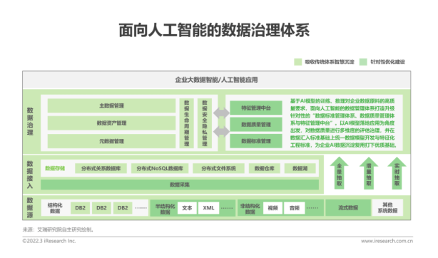 企业在部署AI应用时,数据资源的优劣极大程度决定了AI应用的落地效果。因此,为推进AI应用的高质量落地,开展针对性的数据治理工作为首要且必要的环节。而对于企业本身已搭建的传统数据治理体系,目前多停留在对于结构性数据的治理优化,在数据质量、数据字段丰富度、数据分布和数据实时性等维度尚难满足AI应用对数据的高质量要求。为保证AI应用的高质效落地,企业仍需进行面向人工智能应用的二次数据治理工作。