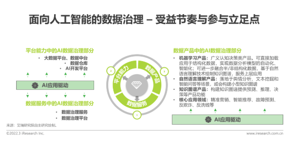 面向人工智能的数据治理服务常包含于数据服务、平台能力和数据产品三类采购形式中。第一类,数据服务即以单独的数据治理产品形式出现;第二类,数据平台,主要包括大数据平台、数据中台、数据仓库和AI能力平台等项目;第三类,数据产品,范围限定在应用AI算法的数据产品,可划分为机器学习产品、自然语言理解产品和知识图谱三类AI产品。为保证AI算法模型的优质运行效果,更好地提供预测、决策、推荐和风控等产品功能,需要对算法模型的训练原料,即支持AI应用的底层数据,进行针对性优化治理。如今AI产品需求旺盛,AI开发平台陆续推进AI产品的规模化落地,且AI数据治理效果与最终平台产品交付效果紧密相连,AI应用驱动成为面向人工智能的数据治理服务的核心立足点。