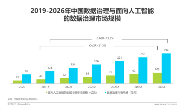 2021年中国面向人工智能的数据治理市场规模约为40亿元。受数据平台服务、数据治理服务和AI应用建设的需求推动影响,面向人工智能的数据治理市场规模将持续上升,2026年突破百亿,达105亿元,2021-2026CAGR=21.3%。2021年,中国数据治理市场规模约为121亿元。作为数据服务的基础工作,中国数据治理市场规模将保持上扬态势,预计2026年市场规模达到294亿元,2021-2026CAGR=19.5%。从发展曲线来看,中国数据治理与面向人工智能的数据治理市场规模增长均处于良性区间,共同巩固相关治理产业生态圈的向好形势。