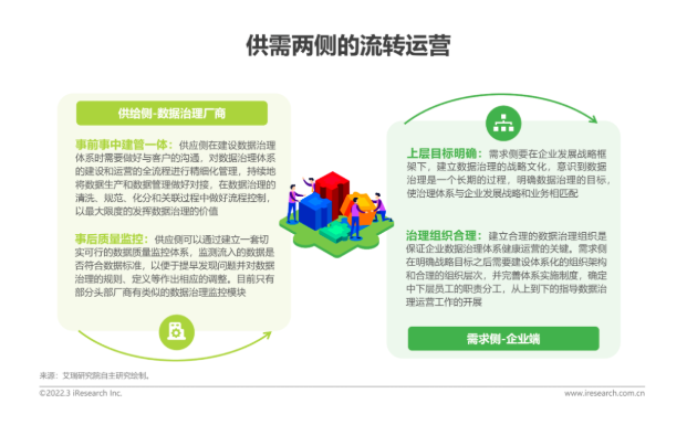 为能充分发挥数据治理的价值、避免一次性数据治理,供需两侧要齐心协力,共同、持续、优质地运营数据治理体系。数据治理是系统性工程,是由上至下指导,由下而上推进的体系工作。因此,供给侧企业与需求侧厂商,在体系运营和建设方面需形成共识,具备明确的目标、合理的组织、严格的监管、完善的系统,这样才能使数据治理工作得到保障,达到体系的流转运营。