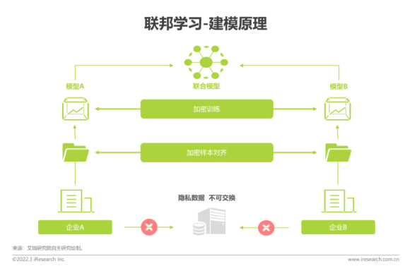 在数据治理及准备过程中,企业一方面需要尽可能全面的获取数据以扩充训练样本规模,另一方面出于隐私与安全的相关要求不能随意收集、融合和使用数据进行AI处理。为解决以上难题,联邦学习技术应运而生。联邦学习的建模原理为基于分布在多个设备上的数据集构建机器学习模型,通过安全多方计算、差别隐私、同态加密等技术为模型提供隐私保证以防数据泄露。因此,联邦学习可有效打通企业间的数据孤岛,并将数据可用而不可见,在满足数据安全合规的基础上,通过连通协同发挥出数据的更高价值。目前,联邦学习技术已成为大数据智能厂商的核心开拓方向,率先在金融、医疗和政务等领域展开应用。