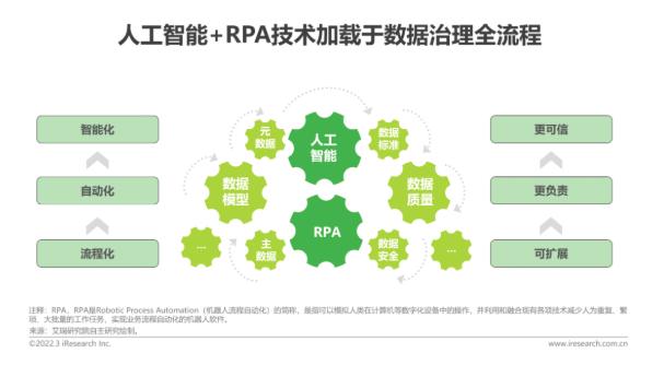 数据规模的指数级增长给数据治理工作带来巨大压力,传统人工方式做数据的清洗、分辨与调优使治理工作耗时冗长,带来高昂的人力成本,且愈发难以满足智能应用对数据在规模量与质量的高要求,传统的人工数据治理工作已变得捉襟见肘。如今,人工智能和RPA等技术手段已被逐渐应用于数据治理的模型管理、质量管理、资产管理、元数据管理等模块,最终实现数据系统的“自治与自我进化”。总体来看,前沿技术手段应用可以让数据治理工作趋于流程化、自动化与智能化,同时让数据变得可扩展、更负责可溯、更可信,已然成为未来数据管理发展的必由之路。