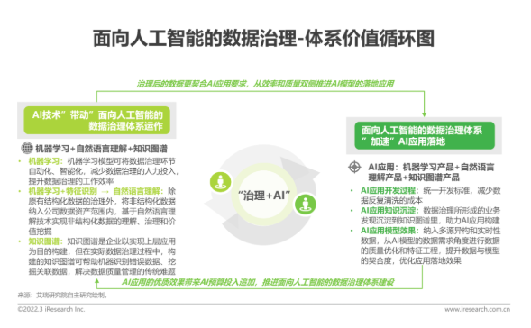 面向人工智能的数据治理充分利用机器学习技术,将数据治理环节自动化、智能化,可极大提升数据治理工作效率,同时基于自然语言理解和知识图谱挖掘关联非结构化数据的应用价值,解决数据质量管理的传统难题,使治理后的数据更加契合AI应用的要求,从效率和质量双侧推进AI模型的落地应用。同时,AI应用落地效果的显著优化也会给企业带来更多智能化转型信心,让其加大相关AI项目的预算投入,进一步推进了相关治理体系建设,打造“治理+AI”的良性循环。