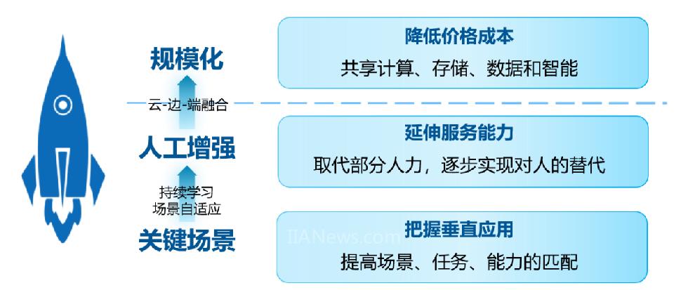 类似互联网的三级火箭发展模式,第一阶段——关键场景,把握垂直应用,提高场景、任务、能力的匹配,提高机器人在关键应用场景的能力,扩大用户基础;第二阶段——人工增强,通过加入持续学习和场景自适应的能力,延伸服务能力,取代部分人力,逐步实现对人的替代,让机器人的能力满足用户预期;第三阶段——规模化,通过云-边-端融合的机器人系统和架构,让机器人达到数百万千万级水平,从而降低价格成本,实现大规模商用。
