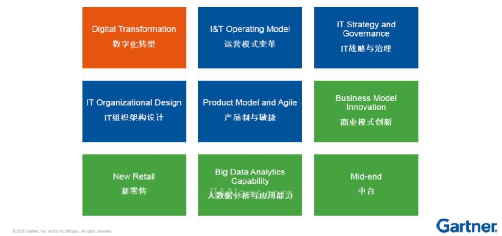 无论学界抑或业界,当前数字化转型的重点可以归结为“一个‘转型’下的两个‘模式’变革”。具体而言,第一个模式是指“IT运营模式”——IT运营模式变革会涉及IT战略与治理、IT组织架构设计、产品制与敏捷。另一个模式是指“商业模式”。在商业模式创新的大背景下,新零售、大数据分析与用能力以及中台是目前的热门话题和概念。
