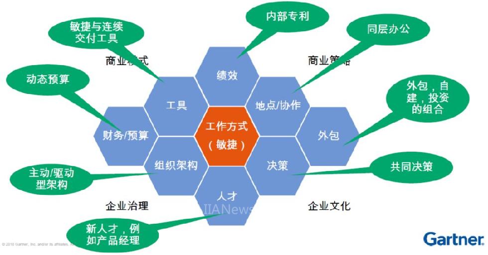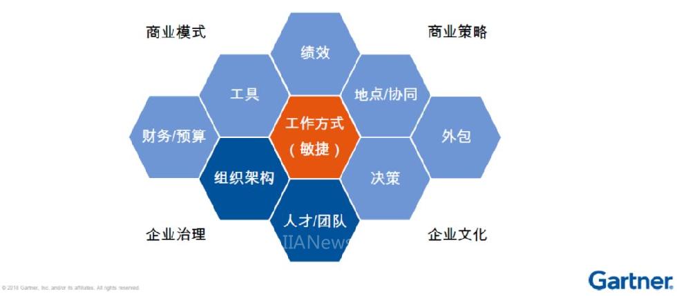 事实上,敏捷的引入不只会带来工作方法、开发工具或切入模式的变革,更是会触发整个运营模式变革中的重要一环——即工作模式的变革。Gartner认为运营模式是一个“由九个相关要素组成的有机体”。举例而言,九个要素休戚相关的原因在于,当企业的工作方式改变之后,人才团队会随之调整,譬如加入能够操盘敏捷的员工;新的人才团队会进一步迫使组织架构发生变化。与此同时,企业的外包和财务预算模式会在运用敏捷的过程中进行动态调整,以此确保敏捷的交付与开发能够顺利进行。可以说,由于九个要素牵一发而动全身,因此企业不得不进行全面变革,否则就无法全面推进数字化转型。因此,企业需要思忖在数字化转型中引用敏捷之后所带来的具体影响。