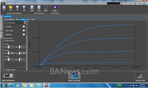 • 通过TSPLink 系统支持高达4台2450源表间的互连。客户现在可以控制多达4台2450并绘制结果。一个简单的例子是构建一台与2通道低功耗曲线绘图仪相当的装置。它具备了绘制器件曲线族的能力,如下图示例所示。