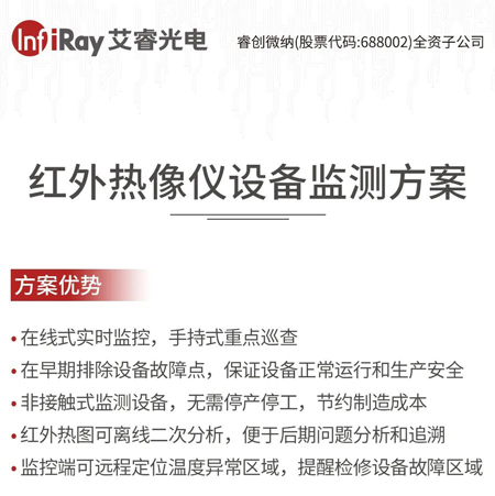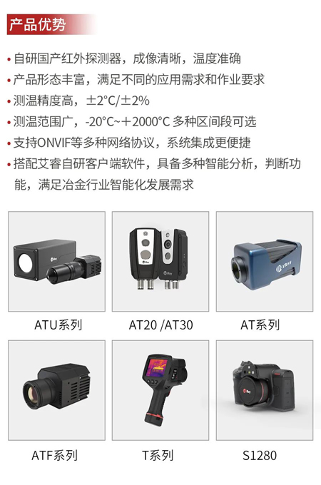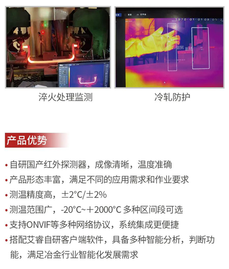 艾睿光电红外热像仪可全天时、全天候、全方位满足治金行业实时精准测温需求,提供温度异常点的自动追踪和报警,控制端观察温度异常区域。实现设备检测、流程管控系统化的全方位护航。