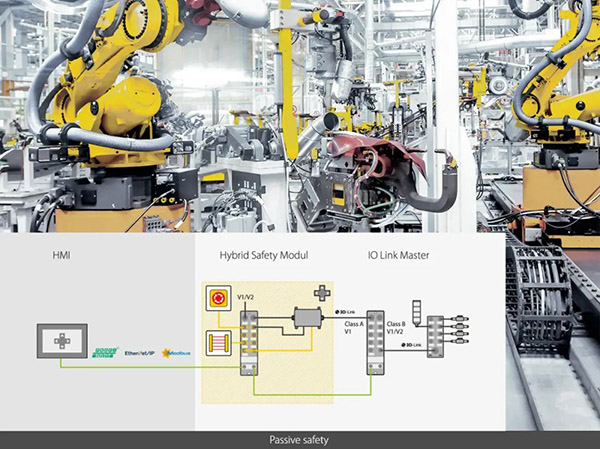 带无源安全性的分布式概念基于执行器与传感器电压之间的持续电隔离。在紧急情况下,可以安全关闭执行器电压,而传感器系统仍保持激活。优势:所需安全输入最少,可节省成本,且在紧急情况下仍可进行诊断。