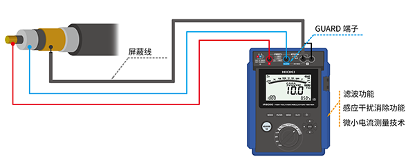 在绝缘电阻测量中,来自周围环境的电磁干扰会导致测量值波动。例如当高压电缆等测量对象的电阻很高时就会出现这种情况,即使是操作人员的移动或电缆轻微的晃动都会影响测量值。IR5050 和 IR5051 消除了电磁干扰导致的数值波动,即使在测量非常高的绝缘电阻时,也能准确地确定绝缘老化程度。