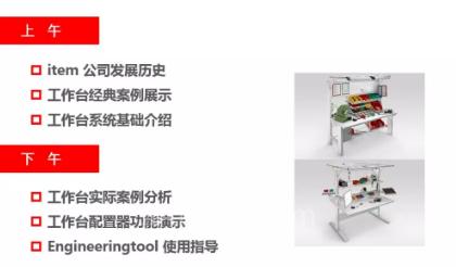 经过 20 多年的积累, 如今,item 的工作台系统已经成为一个相当庞大的系统,因此我们安排了一整天的课程。从公司的发展历史开始,逐步展开到产品细节,还会现场演示 item 灵活的工作台产品配置器。