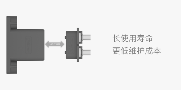 移动机器人充电具有高频率的特点,尤其是充电桩侧连接器对接频繁,在使用周期内需要进行数万次插拔。AGV-CC6充电连接器的插拔次数高达10万次,完全满足移动机器人的全寿命周期使用,让维护成本降至更低。