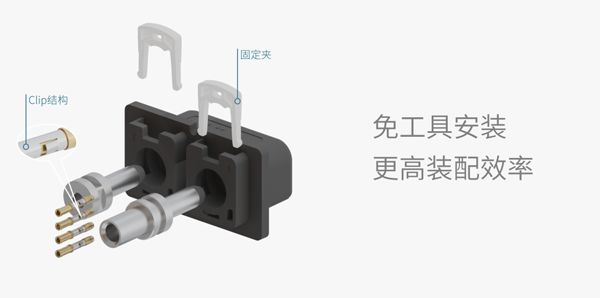 AGV-CC6插针安装采用卡扣锁紧方式,操作人员无需任何工具,即可手动进行电源和信号插针的装配,提高生产效率。