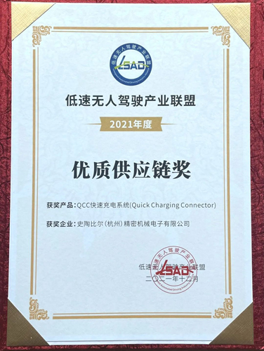 6月16日,中国低速无人驾驶场景生态共建拓展大会于深圳召开,会上颁发了2021年度低速无人驾驶行业优质供应链奖,旨在加快功能型低速无人车的落地应用,推动和甄选行业先进技术力量,搭建产业链品牌聚集平台。史陶比尔携QCC快速自动充电解决方案脱颖而出,荣获该奖项。