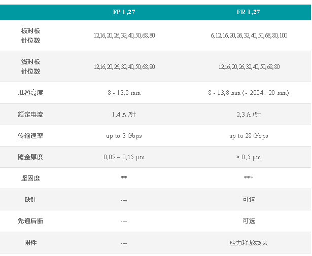 菲尼克斯电气FINEPITCH板对板连接器家族中,作为FP 1,27系列的迭代产品 – FR 1,27,与之前的FP 1,27系列及市场上对应竞品完全兼容;并且数据传输速率全面提升:从3 Gbps提高到最大28 Gbps;同时带来澎湃动力:从每位载流1.4 A提高到每位2.3 A。