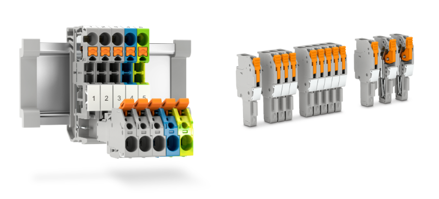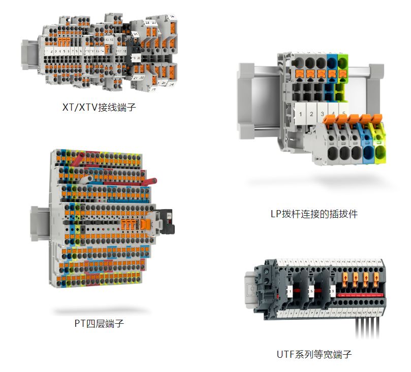 UTF系列等宽端子解决方案提供直通型、刀闸型、保险丝型等3种主件产品类型:
