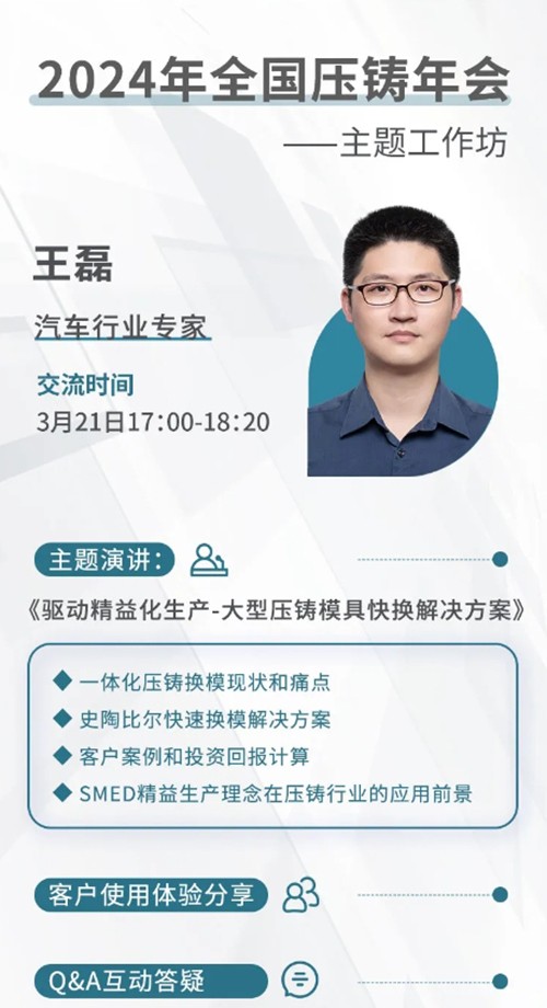 本次压铸年会,史陶比尔汽车行业专家将基于丰富的快速换模方案落地经验,在专题研讨环节进行经验和客户案例分享,同时我们也邀请了正在使用史陶比尔快速换模方案的客户,分享使用体验和效果。
