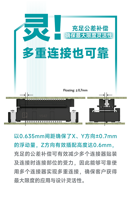 随着各类设备向小型化和多功能化发展,特别是在受运动影响的电子设备中,使用连接器会面临两个主要挑战:一是需要对制造和装配的公差进行补偿;二是需要对因冲击、振动以及温度变化导致的电路板位移进行“容差”处理。