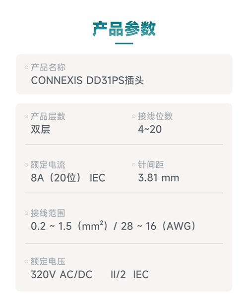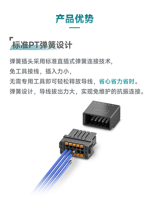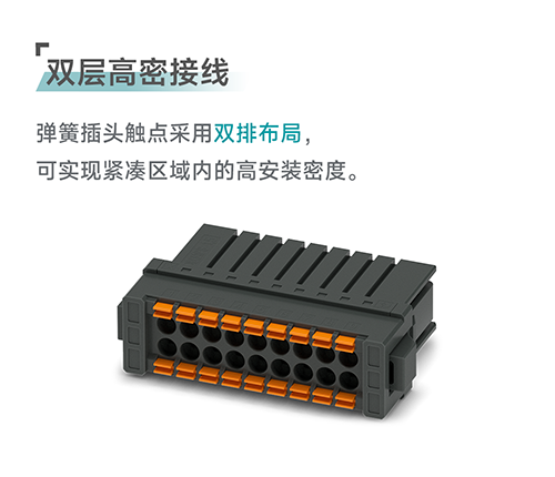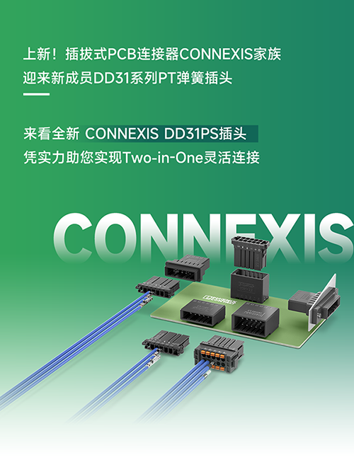 为了响应这一需求,菲尼克斯电气在其经典PCB连接器家族COMBICON诞生50周年的2022年,开始推出全新插拔式PCB连接器——CONNEXIS系列。2024年,我们推出了DD31系列PT弹簧插头,至此,CONNEXIS系列已发展为以压接为主要连接方式,兼具独特的Two-in-One设计的产品系列,满足全自动布线的同时,让客户接线更高效更灵活。