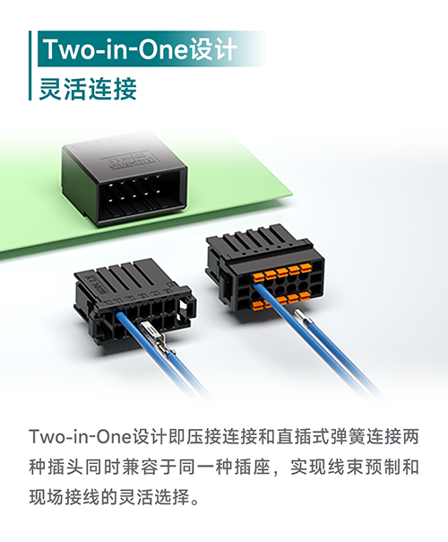 随着工业自动化的不断发展,我们对设备的生产和使用都提出了更高的要求,既希望工厂的设备生产能够更加高效,又希望终端客户的设备使用能够更加灵活。这对于PCB类连接器也提出了新的挑战和要求,即既能在设备内部采用高效的工厂自动化布线方式,又能在设备外部实现高效灵活的现场布线方式。