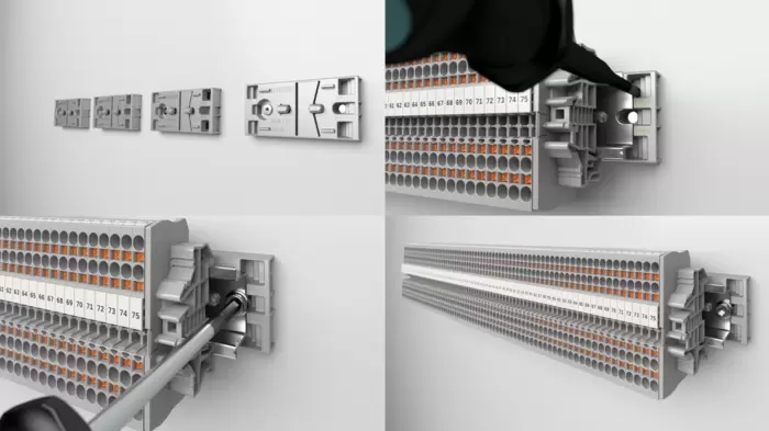 RailFIX DIN导轨适配器助力轻松安装端子条,即预装配有接线端子的DIN导轨。采用RailFIX安装系统,无需为DIN导轨固定预留空间或拆卸和重装任何组件。将预组装端子条连接到适配器并在锁扣下方侧推,即可轻松固定。因此,在DIN导轨末端使用单颗螺钉便可实现可靠固定。由此确保快速安装完全预装式端子条,提高了控制柜制造中的整体组装效率。